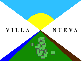 The flag is quartered per saltire, 1. White charged with "VILLA" in black letters, 2. Blue a yellow rising sun, 3. white charged with "NUEVA" in black letters, 4. Green border dark blue on the left and