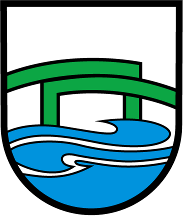 shield base covered with three blue waves, a green bridge broken by a right step, adjoining." The