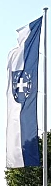 The coat of arms is shield-shaped, with a white (=silver) cross pattée (four equal arms) in the centre on a