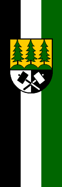 | Description of arms (German): | Erniedrigt geteilt; oben in Gold auf drei grünen Hügeln je ein grüner, schwarzstämmiger Nadelbaum; unten gespalten von Silber und Schwarz mit zwei schräggekreuzten Schlegeln in gewechselten Farben. |
