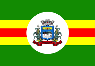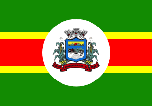 Horizontally divided green-yellow-red-yellow-green, approximately 5-2-2-2-5, with the municipal arms in the centre on a white disk.