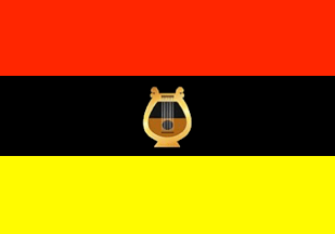 Horizontal triband, red-black-yellow, with a lyre in the centre.