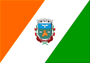 The flag of Holambra is diagonally divided, per bend sinister, orange-white-green with the municipal coat of arms in the middle.