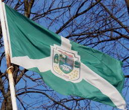 The community flag (I assume it is the flag of the former Town of Forest) can be seen here: http://www.flickr.com/photos/markeburr/5437342476/in/set-72157625906598474