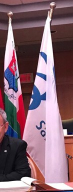The flag has the arms on a white canton. The rest of the field is burgundy on