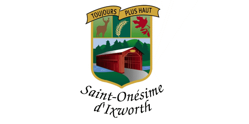 The flag of the Municipality of Saint-Onésime-d'Ixworth in MRC de Kamouraska, Quebec, is white with the municipal crest on it: