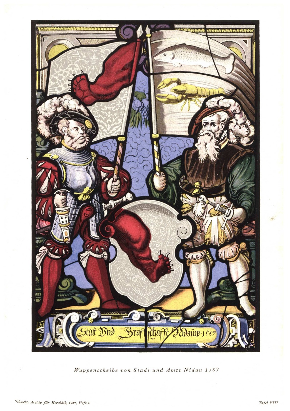 Argent a crayfish upright Gules and a trout haurient Azure dotted of the Second.