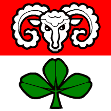 Per fess Gules a Ram's Head caboshed Argent and of the last a Trefoil Vert.