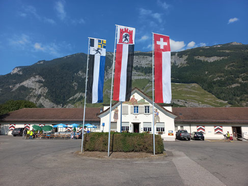 Knatterfahnen are similar to Flaggen, but hoisted from the long side and have no swallow tail. They normally show the national, cantonal or communal flag in their chiefs [photo, source].
