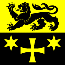Per fess Or a Lion passant Sable langued and armed of the field and Sable a Cross pattee couped