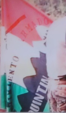 - Same as the above and it adds the inscription "MOVIMIENTO ARMADO" above the mountain range in black capital letters (most likely Times New Roman Font type) and inside the mountain range "QUINTIN LAME" in white capitals (see image). Source: screenshot from TV news Caracol aired today. Notice that the flag has the same inscription in the obverse as well as the reverse.