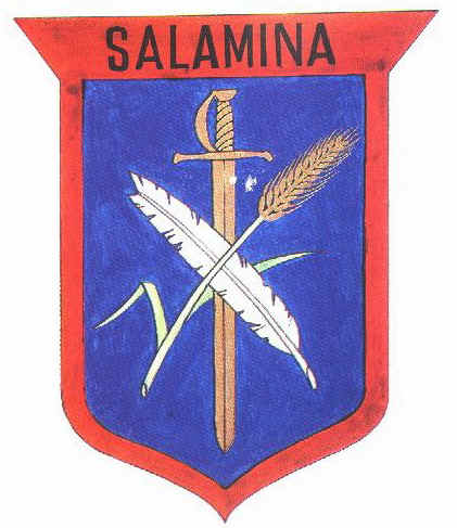 Salamina blasona con una espada, una espiga y una pluma. Estos
