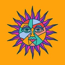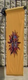 Its flag is a vertical yellow banner featuring a multicolored sun
