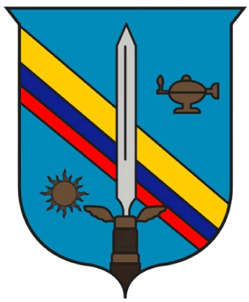 The logo is a shield with a blue field for the military officials, having a diagonal (top-left to bottom-right) stripe in the Colombian national colors. In the center is a sword indicating its
