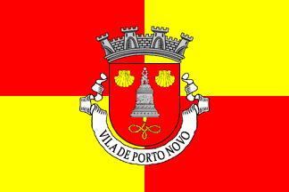 It is a typical Portuguese municipal flag, consisting of a 2:3 red over yellow quartered background with the coat of arms centered on it. Mural crown Argent with four visible towers (town rank) and white scroll reading in black upper case serifed letters "Vila de Porto Novo". The banner should have golden and red tassels and cord, and golden staff with a spear finial.