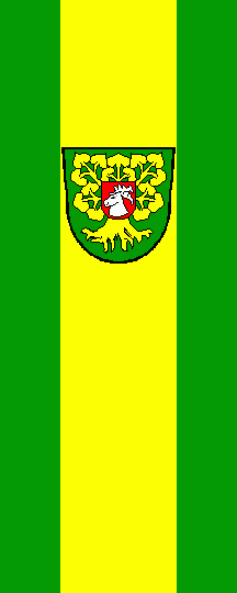 It is a green-yellow-green vertical triband with ratio of stripes 1:2:1. The coat of arms is shifted towards the top in the yellow stripe.