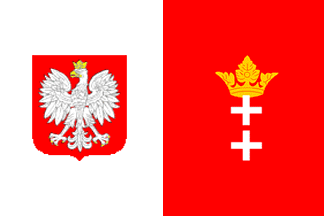 Neubecker 1992 [neu92] contains a plate with the flags of Danzig, and here we find a state ensign, like the ordinary flag - two white crosses placed over each other with a golden crown on top - with a swallowtail cut out of the fly end. Both flags are 2:3 in ratio.