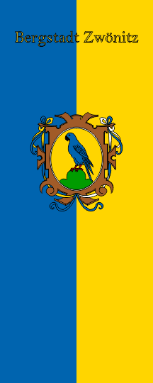 It is a blue-yellow vertical bicolour. The coat of arms is shifted towards the top. At the top edge is a black inscription "Bergstadt Zwönitz".
