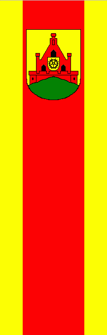 The flag's ratio is 3:5. It is a red over yellow horizontal bicolour. The coat of arms is shifted to the hoist.