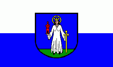It is a white-blue vertical bicolour. The coat of arms is shifted to the top.
