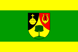 It is a yellow-green-yellow vertical triband with ratio of stripes 1:3:1 and arms shifted to top in the central stripe.