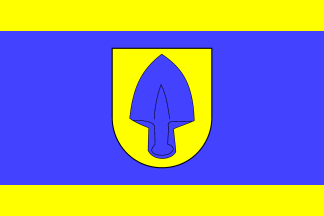 It is a yellow-blue-yellow vertical triband with ratio of stripes 1:3:1 and arms shifted to top in the central stripe.