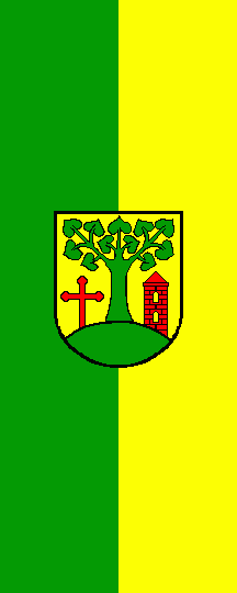 Shield Or, issuant from base a mount Vert, on ist top a linden Vert, flanked by a cross pommy Gules at dexter and a tower Gules masoned Sable with windows Or and a cone roof Gules.