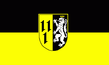 The flag's ratio is 3:5. It is a black over yellow horizontal bicolour with centred arms.
