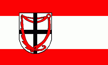 The flag's ratio is 3:5. It is a red-white-red horizontal triband with ratio of stripes approx. 1:3:1. The coat of arms is in the middle of the central stripe.