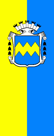 It is a yellow-blue vertical bicolour. The coat of arms is shifted towards the top in a white Baroque cartouche with three black bells in pale on either side.