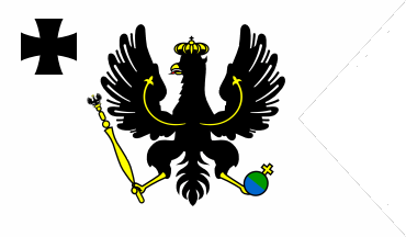 A white flag with a crowned Prussian eagle (a black eagle with the letters FR [Fredericus Rex] on the breast) with sword and scepter.