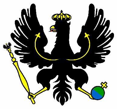White swallow-tailed flag with a crowned black eagle with gold scepter and gold orb.