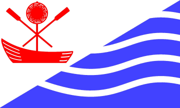 The sheet is divided per bend sinister. The upper hoist is white showing a red ferry boat with two oars crossed per saltire. The lower fly is blue divided by four white waves.