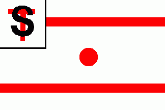 It is a white flag divided by two horizontal red stripes. Between the stripes in the centre of flag is a red disc. The flag has a white squarish canton, fimbriated black containing a black "S" superimposing a slightly bigger black see (left image above) or red (right image above) "T".