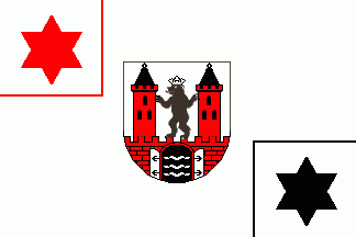 It is a white flag divided by an off-centred, red cross cotized white and black. In the upper hoist quarter is a red griffin's head armed golden(=yellow) and flanked by three blue 6-point stars.