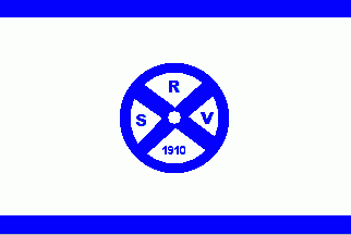 The white flag has blue horizontal stripes at top- and bottom edges. In i9ts centre is a blue wheel with four spokes. Between the spokes are blue inscriptions as follows: "S" (hoist), "R" (top), "V" (fly) and "1910" (bottom).