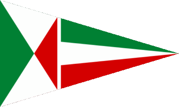It is a triangular pennant (see left image above). Its left half (hoist) is divided by saltire into green (hoist), red (fly) and white (bottom and top).