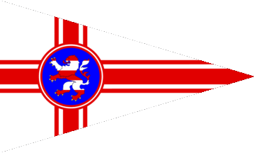 It is a white flag with a blue-cotized red scandinavian cross superimposed by a white roundel cotized blue-white-blue and a rampant lion from the coat of arms of Hesse within. The lion is crowned and facing the hoist and holding the shield of RV Cassel in its paws. Its fur is of alternating red and white horizontal stripes. In the upper hoist shifted to the edge is a blue-white-red very special insription "RKC" over "V".