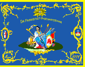The flags ratio is approx 7:9. It is a blue flag. A woman. perhaps Hammonia, is sitting in the centre on a pedestal, surrounded by military equipment and holding at one arm a shield with the coat of arms of Hamburg (red catle, silver/white shield). Behind her is a winged hat of ancient God of Hermes, who was worshipped as the God of merchants, balanced on a stick. Above her is a motto, embowed in golden capitals "DIE FREIHEIT IST UNSCHAETZBAHR" (=Freedom is invaluable), topped by an eye of God within a triangle of golden rays, the symbol of Holy Trinity but also of God’s omniscience and symbolizing his vigilance over the city. A small image of St. Nicolas in a golden cartouche, i.e. an oval ornament, at the hoist side, on the opposite side a shield, showing a man in a landscape with snowy mountains, crested by a woman with sword and scales, probably Goddess of Iustitia. A golden inscription is "Anno" on the lower hoist corner, a golden "1771" on the lower fly. The flag has a golden bordure at three sides and the central image is surrounded by golden Rocaille ornaments.