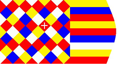 Ducal regiment flag: The ratio was approx 11:19 plus an embowed end added to the fly. The hoist consists of diamonds of the colours blue, red, yellow and white. The fly consists of nine horitontal stripes in order: yellow-blue-red-yellow-red-blue-white-yellow-red. One single red diamond is superimposed by a small white cross like that one of Schwyz canton, but in this case it is the ensign of the alliance of Huguenots.