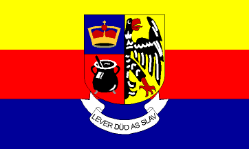 The flag shown here with the coat of arms is sometimes shown with a smaller shield above a white scroll on which is written Lever düd as Slav.