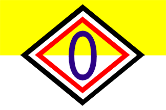 Then there is the ever welcome German eBay table flag found in offer no. 220120375431 (end 19 Jun 2007) put up by "kaethedorsch1". Divided per saltire blue (top, bottom) and white (hoist, fly) and a white discoid with black outline in the centre, bearing black initials "OHF" without serifs. "Discoid" as the rim is not quite circular but octagonal with eight nicks. This figure may represent something technical but then we may be reasonably certain that when seen from a distance it resembles a disk.