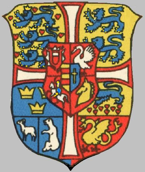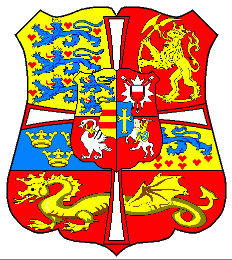 for details). The escutcheon originally contained quarterings for areas, over which the king actually reigned at various periods or to which he laid claim. In the Middle Ages the king´s younger sons bore one or two lions to denote their status as vassals. The two Slesvig lionsSlesvig lions are known from 1245 and in 1460 became part of the king´s coat of arms together with the Holstein nettle leaf, which was originally the family coat of arms of the Schauenburgers. In the 13th century, the Counts of Halland, one of the bastard lines of the royal family, bore a lion above a number of hearts. In 1449 Christian I added a lion surmounting nine hearts to his coat of arms for the title of "the Goths", presumably as part of his efforts to dominate Sweden, where the patriotic myth of the Swedes as the descendants of the victorious Goths greatly contributed to a sense of national understanding. In 1440, the dragon-like wyvern representing the title of "the Wends" was added; it can symbolise heathendom and thus refer to the earlier victory over the heathen Wends. The two Oldenborg bars were introduced by Christian I, and in the king´s coat of arms from the time of Frederik I we find the fitchy Delmenhorst cross. The swan of Stormarn with a coronet around its neck is known from 1476. The Dannebrog cross was incorporated into the king´s coat of arms from the time of Erik VII of Pomerania, as were the axe-bearing lion of Norway and the Swedish coats of arms. The three crowns were actually the Swedish coat of arms, but became a symbol of the Kalmar Union´s three Scandinavian realms. After the break-up of the Union Christian III, from 1546, used the three crowns as arms of pretence, and in this way Danish-Norwegian kings betokened a political will also to rule Sweden. The use of the three crowns was opposed by Sweden, especially in the 16th century. Quarterings for Bavaria and Pomerania were found under the kings, who hailed from those countries. The conquest of the Ditmarshes in 1559 was marked by a quartering with a horseman. From the 16th century Iceland was represented by a crowned stockfish, but from 1903 by a falcon. The ancient arms of the Faroe Islands, the ram, were from 1668 combined with that of the king, and the Greenlandic bear is known from 1665. In 1819 a horse´s head was added for Lauenburg.