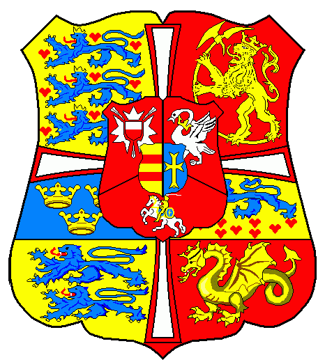 Shield quartered by a Dannebrog cross (white with red fimbriation), 1st quarter Or semi of nine heartlets Gules three lions passant Azure in pale, crowned and armed Or; 2nd quarter Gules a lion rampant Or crowned of the same and holding a halberd embowed of the same; 3rd quarter parted per fess, above Azure three coronets Or ordered 2:1, beneath Gules a crowned wyvern Or (front half); 4th quarter parted per fess, above Or a lion passant Azure on chief and eight visible heartlets Gules ordered 3:3:2 in base, beneath Gules a crowned wyvern Or (rear half); escutcheon quartered as follows: 1st quarter Or two lions passant Azure in pale, armed Or and tongued Gules, 2nd quarter Gules an inescutcheon parted per fess of Argent and Gules superimposing a nettle leaf Argent and three nails of the same in pall reversed, 3rd quarter Gules a swan passant Argent gorged by a coronet Or, 4th quarter Gules a knight Or with a sword Argent on a horse forcene Argent bridled Or; inescutcheon parted per pale, at dexter Or two bars Gules, at sinister Azure a cross fitchy Or.