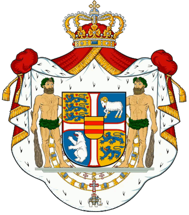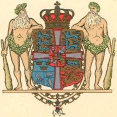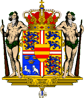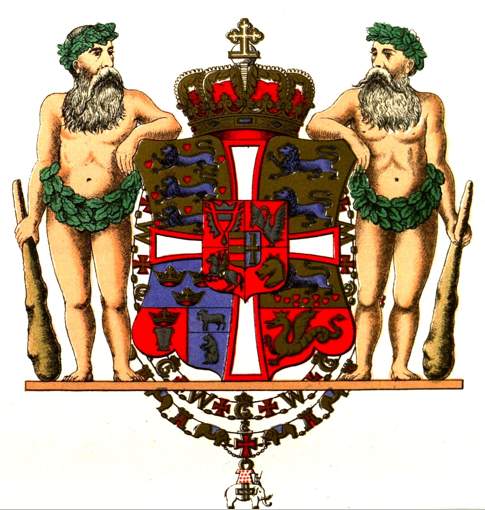Two savages (Danish: vildmænd) act as supporters; this element can be traced back to the early reign of the Oldenburg dynasty. Similar supporters were used in the former arms of Prussia. The shield features the insignias of the Order of the Dannebrog and the Order of the Elephant around it.