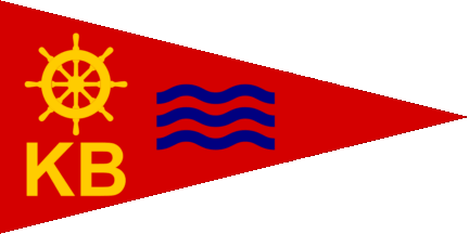 The pennant is red. At hoist is a yellow steering wheel above and a yellow inscription "KB" below. On centre there are three blue waves.