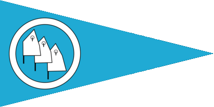 The pennant is light blue. At hoist in a white annulet are three white optimist sails with black marks in bend.