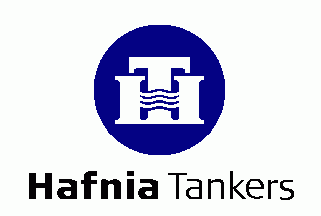 The company is based in Hellerup, just north of København. The flag is white with a black inscription at bottom "Hafnia (bold) Tankers". Above in a dark blue disc is a white logo consisting of a serifed "T" flanked by the vertical bars of a serifed "H" with its horizontal bar consisting of three waves.