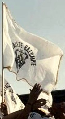 The official flag of Albacete Balompié is white with the club's emblem. On unofficial versions of the flag (photo, photo), the emblem is surrounded by the club's name written horizontally in yellow letters, "Albacete" on the left, "Balompié" on the right.