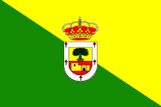 Flag: Rectangular, in proportions 2:3. Composed of two triangles formed by a diagonal running from the hoist's upper part to the fly's lower part, green at hoist and yellow at fly. Charged in the center with the municipal coat of arms in full colors.